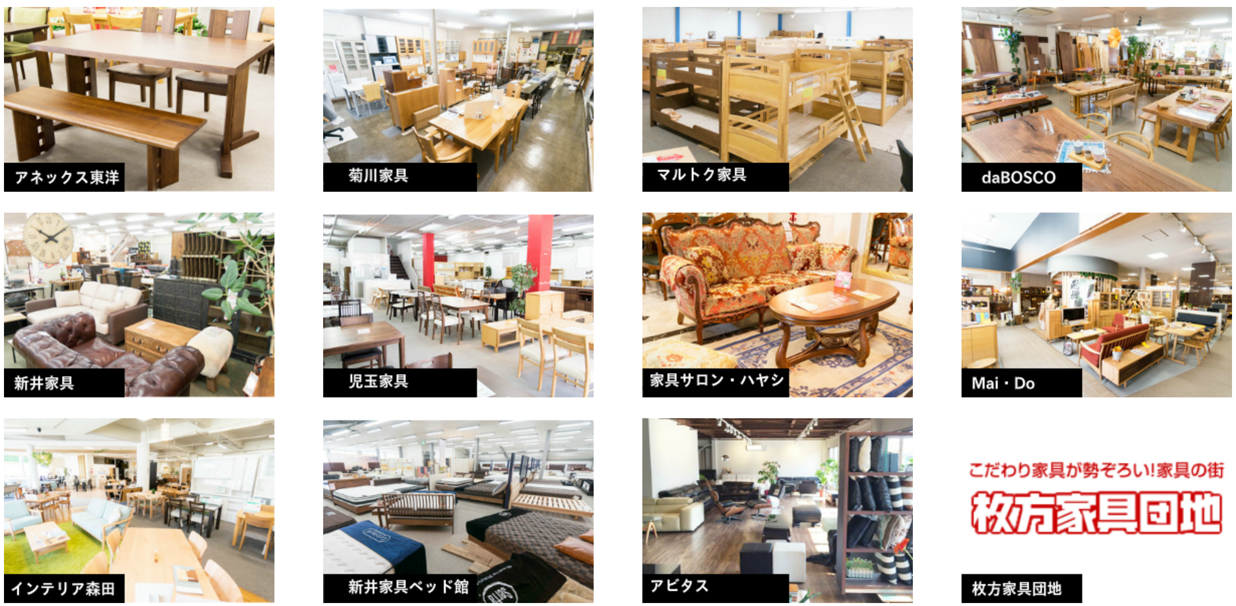 「すてきな家具に出逢うまち」として明るいまちづくりを目指す家具団地には個性豊かな家具専門店が19店舗、軒を連ねています。